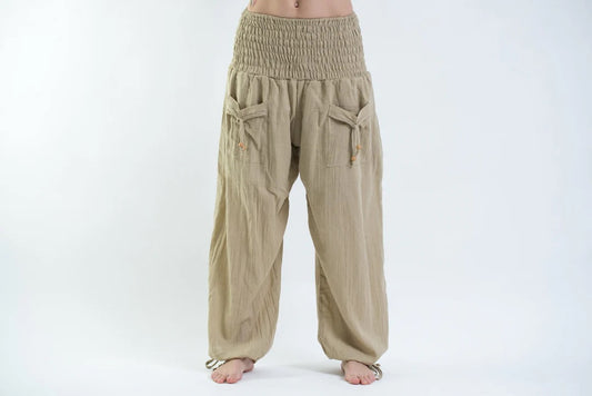 Thai Smocked Waist Cotton Pants in Tan, Thailand