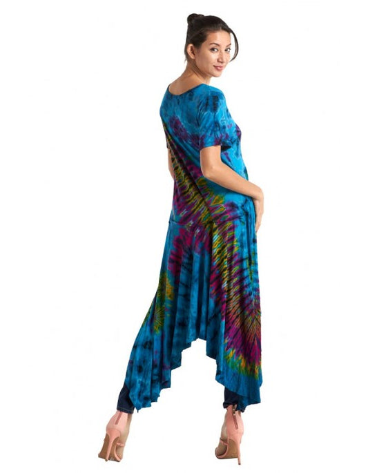 Blue Tie Dye Short Sleeves Tunic Top With Pocket, Thailand
