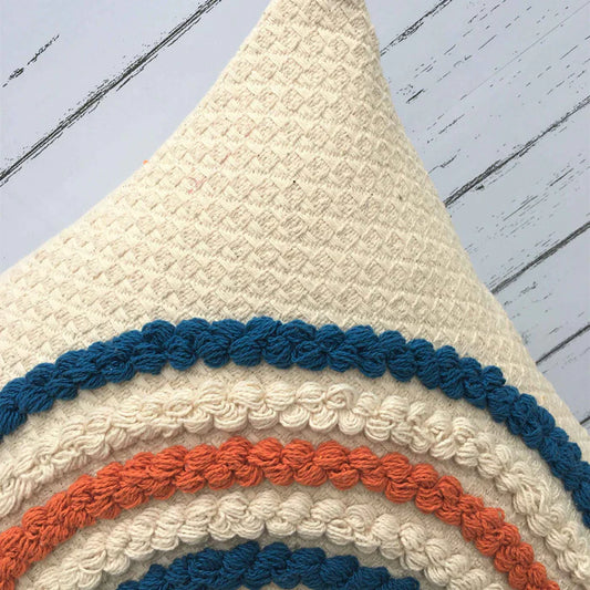 Hand Tufted Fringes Boho Stripe - Ivory, Blue, Orange - Pillow Cover, India