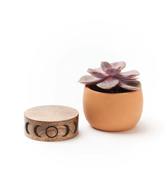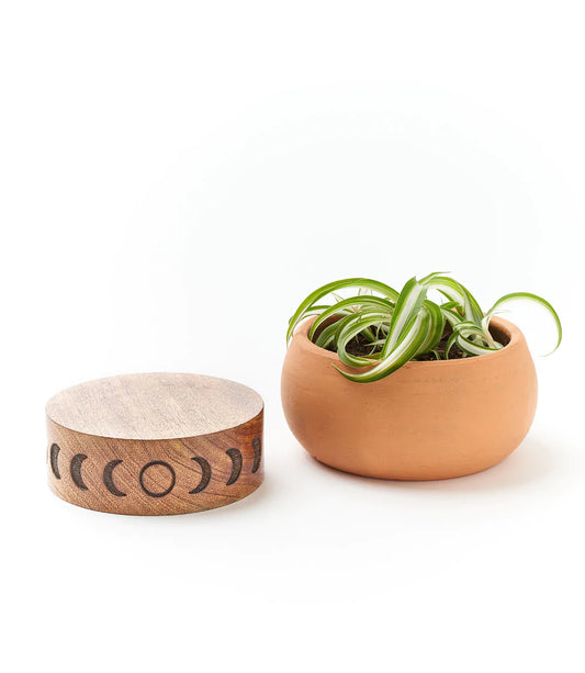 Terracotta Plant Pot with Mango Wood Stand - Small Moon Phase, India
