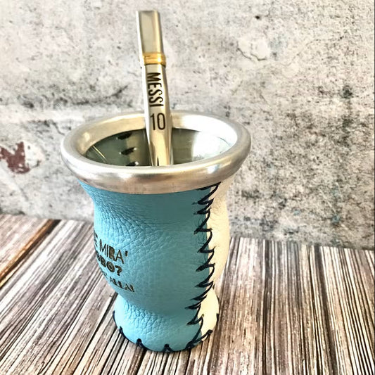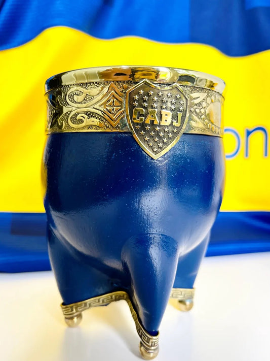 Handmade Argentine Mate Gourd: Boca Juniors Blue Leather & Bronze-Set