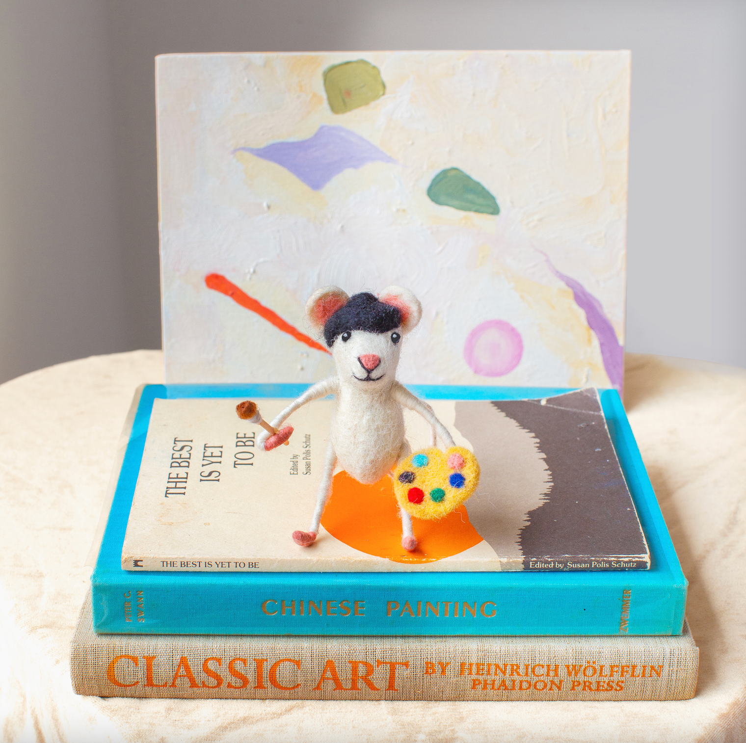 Paint brush and pallet poised, with a jaunty beret, a helpful nod to the grandmasters of the past! Each Sew Heart Felt mouse is skillfully crafted by needle felting teeny layers of loose wool fibers, creating a sculptured and realistic little animal.